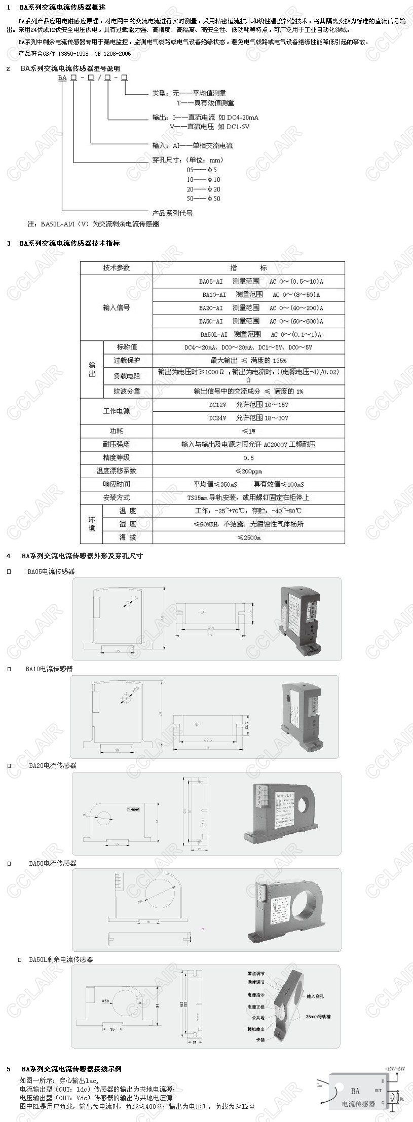 BA05-AI/I,BA10-AI/I,BA10-AI/V,BA20-AI/I-T,BA50-AI/V-T,BA,交流電流傳感器