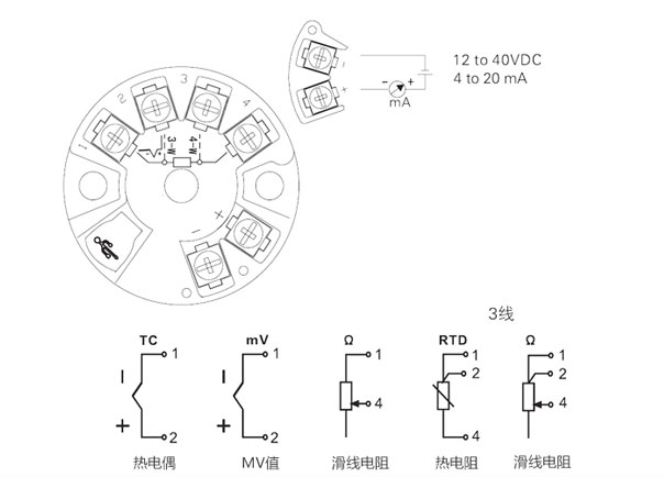 頂部安裝式智能溫度變送器,用于熱電阻(RTD)、熱電偶(TC)、電阻(Ω)、電壓(mv)信號輸入,二線制4-20MA模擬輸出,安裝于傳感器內(nèi)部。