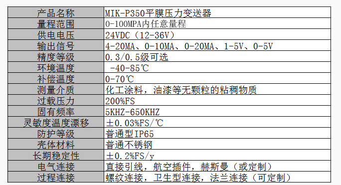 MIK-P350平膜壓力變送器采用高精度箔式應(yīng)變計,配以多種具有特色的放大電路,如抗干擾型、耐高溫型等,使得該型適用于多種工作環(huán)境,加之無腔結(jié)構(gòu)特點,尤適于測量粘度大和泥漿,水泥,原油等有顆粒的流體行業(yè)的壓力測量場合。