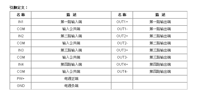 接通電源后,當(dāng)輸入IN1接通,則對(duì)應(yīng)的OUT1接通;反之,當(dāng)輸入IN1斷開,則對(duì)應(yīng)的OUT1斷開。其他通道類似。
