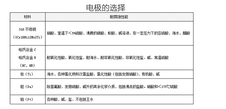 電 極:不銹鋼316L、哈氏合金(HB和HC)、鈦、鉭、鉑