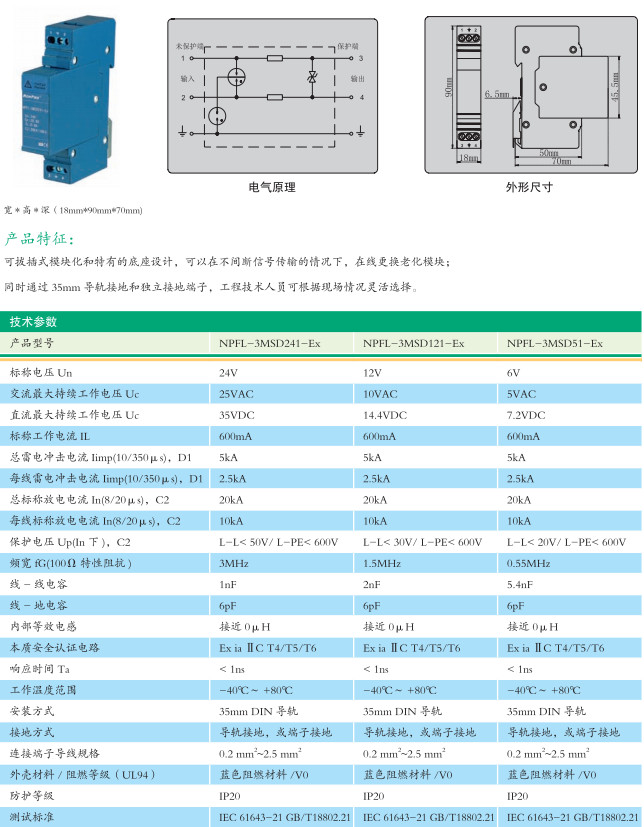 PFL-3MSD51-Ex,NPFL-3MSD121-Ex,NPFL-3MSD241-EX,二線制本安型信號浪涌保護(hù)器(浮地)
