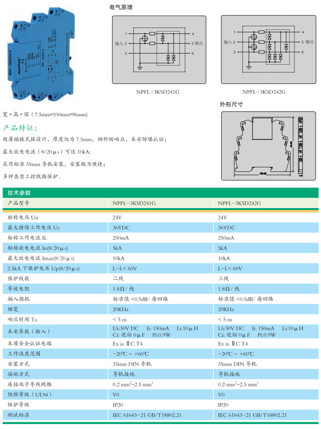 NPFL-3KSD242G,NPFL-3KSD241G,接地本安型信號浪涌保護器
