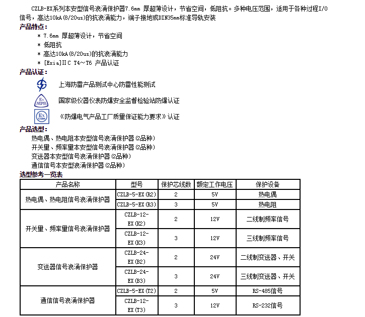 CZLB-5-EX(R2),CZLB-5-EX(R3),CZLB-12-EX(K2),CZLB-12-EX(K3),信號浪涌保護器