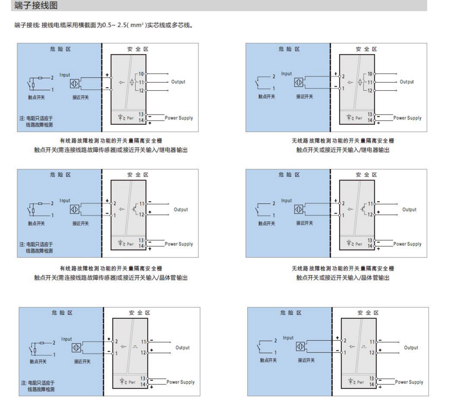 (說明: 當(dāng)用到線路檢測功能時,如果需要使用機械觸點開關(guān)作為輸入設(shè)備,必須在輸入回路中連接線路故障傳感器,以避免開關(guān)量隔離安全柵將機械觸點開關(guān)正常的通斷誤當(dāng)做輸入回路的斷路或短路故障。)