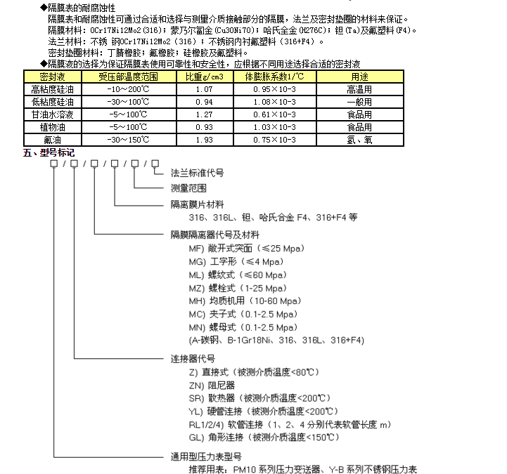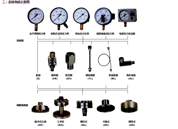 結構原理 隔膜壓力表由各種通用型壓力儀表和不同結構的隔膜隔離器組成一個封閉系統(tǒng),內充密封液。當被測介質的壓力作用于隔膜時,則隔膜產生變形,壓縮封閉系統(tǒng)中的密封液。由于密封液的固有性質,使壓力儀表中的彈性元件產生相應的彈性變形一位移,經指示裝置顯示壓力值。當隔膜的剛度足夠小時,則壓力儀表指示的壓力就近于被測介質的壓力值。