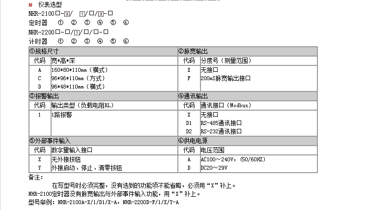 概述 NHR-2100/2200系列定時器/計時器采用全自動貼片封裝工藝,具有很強的抗干擾能力,并具有多種輸出功能和控制功能,廣泛運用于電力、石化、冶金、輕工、制藥、航空等諸多領域。 6位LED數(shù)碼顯示,顯示范圍寬,并且顯示亮度可以調(diào)整。 具備遞增和遞減兩種計時方式。 具備“定時報警”、“計時報警”功能,帶LED報警燈指示;計時報警時,可選200mS脈寬同步輸出,同時儀表將自動清零且停止報警,并重新開始計時。 支持RS485、RS232串行接口,采用標準MODBUS RTU通訊協(xié)議。 具備儀表按鍵啟動、停止、清零功能操作,也可外接啟動、停止、清零功能按鈕。 輸出、電源、通訊相互之間采用光電隔離技術。 具備多種外形尺寸及樣式供用戶選擇。 面板輕觸式按鍵設置,參數(shù)設置斷電永久保存。