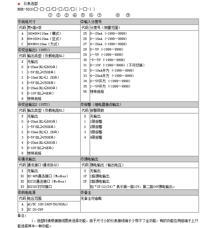 NHR-5620系列數(shù)字顯示容積儀可對工業(yè)現(xiàn)場各類規(guī)則、不規(guī)則罐體的液位進行采集、顯示并轉(zhuǎn)換成對應罐體的容積,適用于對各種過程參量進行監(jiān)測、控制、采集等。 雙屏LED數(shù)碼顯示, 具備11種信號輸入功能,測量精度為0.2%級。 可對各種形狀罐體進行液位〈=〉容積轉(zhuǎn)換測量控制。 采用查表法進行運算 ,可對規(guī)則或不規(guī)則罐體實現(xiàn)高精度的液位〈=〉容積顯示控制。 可帶兩路模擬量變送輸出。 支持RS485、RS232串行接口,采用標準MODBUS RTU通訊協(xié)議。 儀表可帶RS232C打印功能,具有手動、定時、報警打印功能。 帶DC24V饋電輸出,為現(xiàn)場變送器配電。 輸入、輸出、電源、通訊相互之間采用光電隔離技術。 參數(shù)設定密碼鎖定,參數(shù)設置斷電永久保存,具備參數(shù)恢復出廠設定功能。