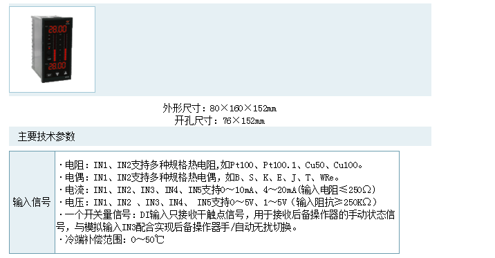WP-KS805系列雙回路串級(jí)智能PID調(diào)節(jié)控制儀,具有5個(gè)模擬輸入(IN1-IN5)2個(gè)模擬輸出(OUT1、OUT2),一個(gè)開(kāi)關(guān)量輸入DI,2個(gè)開(kāi)關(guān)量輸出和豐富的控制算法,適用于鍋爐汽包水位三沖量控制或兩沖量控制并可帶汽包水位壓力補(bǔ)償功能適用于一般工業(yè)過(guò)程中溫度、壓力、液位、流量等各種過(guò)程參數(shù)的串級(jí)控制,前饋控制、雙路控制等,并可帶后備操作器,與后備控制器配套實(shí)現(xiàn)手動(dòng)/自動(dòng)無(wú)擾切換。