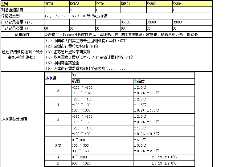 支持K/J/E/T/N/S/R/B等8種類型熱電偶探頭,能測量-200℃-1820℃范圍內(nèi)的溫度。