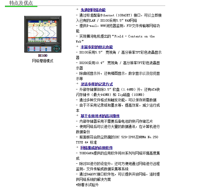 QSTATION網(wǎng)絡增強型DX系列在高分辨率TFT彩色液晶顯示器上實時顯示測量值。數(shù)據(jù)可以保存到3.5英寸軟盤、ATA快閃存儲卡、ZIP磁盤。DAQSTATION網(wǎng)絡增強型有內(nèi)置網(wǎng)頁服務器和E-mail功能,標準配置以太網(wǎng)接口,支持TCP/IP和FTP協(xié)議。附加的通信功能包括帶主/從模式的Modbus功能和FF現(xiàn)場總線功能。