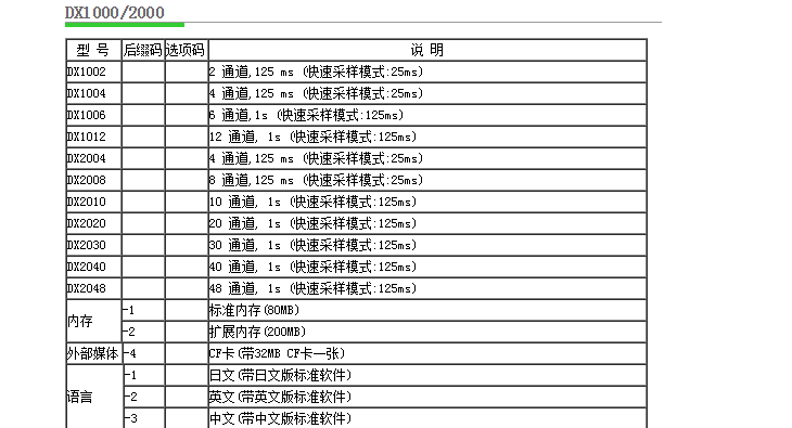 | *1 /A1,/A2,/A3,/A4,/A5以及/F2不能同時選用 *2 /A3和/F1不能同時選用(僅對DX100), /A5和/F1不能同時選用(僅對DX200) *3 /C2,/C3以及/CF1不能同時選用 *4 /H5[ ] D:電源插口 UL,CSA 標準 F:電源插口 VDE 標準 R:電源插口 SAA 標準 J:電源插口 BS 標準 H:電源插口 GB 標準 *5 DX1002,DX1004,DX2004,DX2008 不能選用/N2 *6 選用了/TPS2, 就不能選用 /TPS4, /A2, /A3或 /F1(僅對DX1000) *7 DX1000: 選用了/TPS4, 就不能選用 /TPS2, /A1, /A2, /A3或 /F1 DX2000: /TPS4, /TPS8, /A5, /F2不能同時指定 *8 選用了/TPS8, 就不能同時選用/F1和/A4 *9 /KB1, /KB2不能同時指定,指定/KB1時,附帶1臺遙控器(438227) *10 DX1000: 指定/PM1時,不能指定/A3, /M1, /R1, /TPS2, /TPS4。另外/A2, /F1不能同時指定 DX2000: 指定/PM1時,不能指定/A5, /F2, /M1, /R1。另外/A2, /F1和/A4, /TPS8不能同時指定 *11 只能對DX2010,DX2020,DX2030,DX2040,DX2048指定/MC1 |