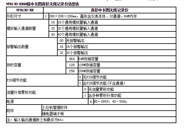 VPR130-RH40路中長圖真彩無紙記錄儀以32位嵌入式CPU為核心,并輔以大規(guī)模集成電路、大容量FLASH存儲、信號智能調理、SmartBus總線以及高分辨率圖形液晶顯示器的新型智能化無紙記錄類儀表。公司產品采用320×234真彩TFT液晶顯示屏;支持16路模擬量萬能輸入、8路模擬輸出、12路報警輸出、16路全隔離24VDC配電輸出,設定數據與記錄數據具掉電保護功能。具有功耗低、精度高、體積小、通道數多、通用性強、可靠性高、運行穩(wěn)定等特點。儀表采用USB Host技術,支持USB 移動存儲器的數據讀寫;采用RS-232C/RS-485通訊接口,支持標準MODBUS-RTU協議,可方便實現遠程監(jiān)控。