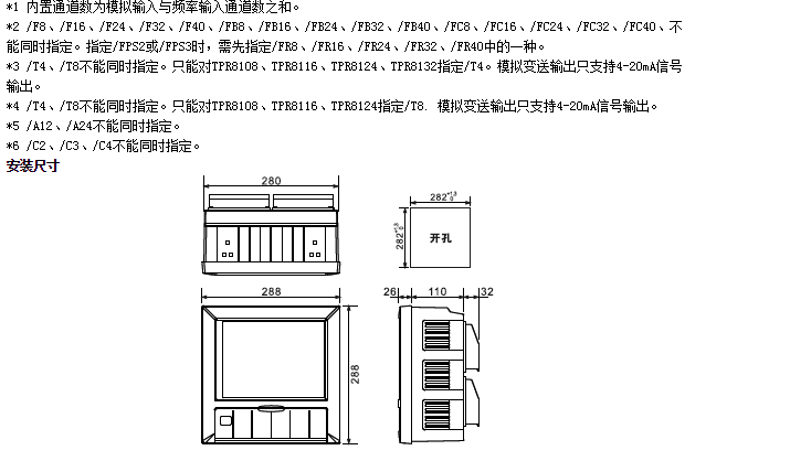 | ●報(bào)警輸出繼電器(/A12,/A24): 輸出點(diǎn)數(shù):從12、24點(diǎn)中選擇。 ●通信功能(/C2,/C3) 媒體:RS-232(/C2)或RS-485(/C3) 協(xié)議:Modbus-RTU(從機(jī))協(xié)議 通信速率:1200/2400/4800/9600/19200/38400/57600 ●打印功能(/C4) 打印機(jī):面板式微型打印機(jī)。 打印內(nèi)容:實(shí)時(shí)數(shù)據(jù)、歷史數(shù)據(jù)、累積報(bào)表。 打印方式:手工打印、定時(shí)打印。 ●模擬輸出(/T4,/T8) 信號類型:4-20mA 輸出點(diǎn)數(shù):從4,8點(diǎn)中選擇。 輸出方式:測量通道的變送輸出。 最大負(fù)載:750Ω ●24VDC變送器電源輸出(TP8): 輸出點(diǎn)數(shù):8回路。 輸出電壓:24VDC。 額定輸出電流:4~20MADC。 最大輸出電流:65mAdc(過電流保護(hù)動(dòng)作電流:約90mA) |