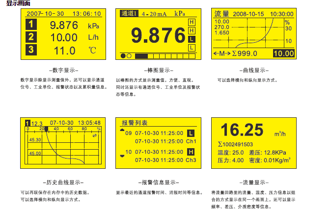 顯 示:發(fā)生報(bào)警時,測量數(shù)據(jù)顯示畫面都有報(bào)警狀態(tài)顯示。