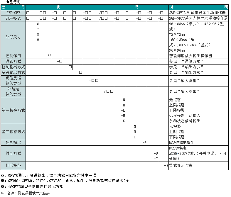 SWP-GFY系列數(shù)字/光柱顯示智能伺服放大輸出操作器是伺服放大器、手動操作器和后備功能一體化智能產(chǎn)品,接收0-10mA/4-20mA/0-5V/1-5V閥位給定輸出信號,輸出正轉(zhuǎn)、反轉(zhuǎn)控制信號。適合于作為DOS系統(tǒng)回路調(diào)節(jié)控制輸出和智能調(diào)節(jié)器控制輸出的后備操作器使用。