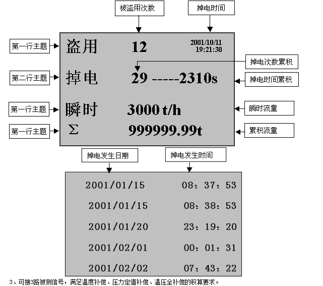 (1)可記錄儀表工作期間發(fā)生掉電的時間、次數(shù)及掉電時間累積值,防止人為或意外掉電造成流量偏差