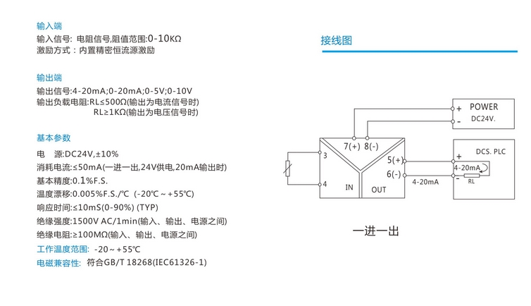 電阻信號(hào)隔離器、變送器輸出范圍:0-20mA、4-20mA、0-5V、0-10V、1-5V等用戶(hù)需要的標(biāo)準(zhǔn)信號(hào)