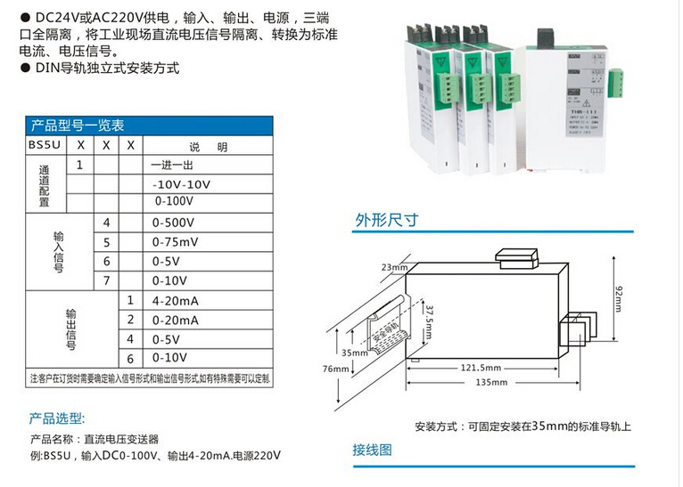 直流電壓變送器輸出范圍:DC4-20mA、0-20mA、0-5V、0-10V、1-5V等用戶需要的標(biāo)準(zhǔn)信號(hào)