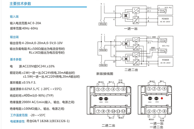 二相電流變送器輸入范圍:AC0-1A、0-5A、0-2A直通等用戶特定