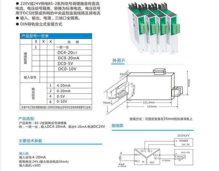 BS-2全隔離信號調(diào)理器 輸出范圍:4-20mA、標準信號