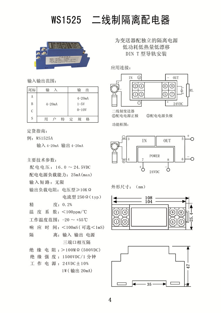 WS1525信號隔離器 二線制電流變送器,直流電流變送器,為變送器配獨立的隔離電源,低功耗、低熱量、低漂移,DIN T型導(dǎo)軌安裝
