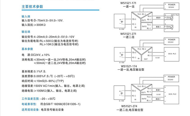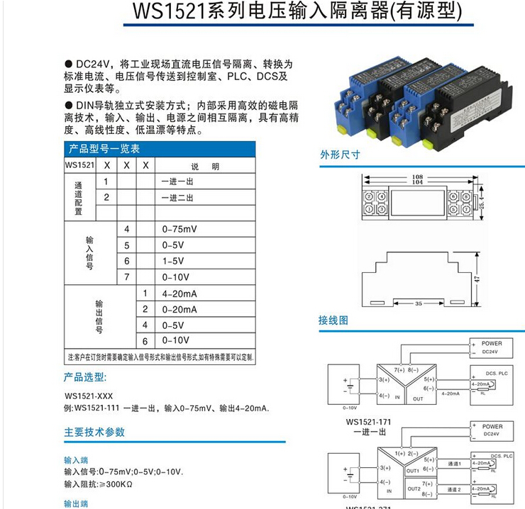 WS1521信號(hào)隔離 輸入范圍:模擬量信號(hào) DC4-20mA、0-20mA、0-10V、0-5V、0-75mv、等