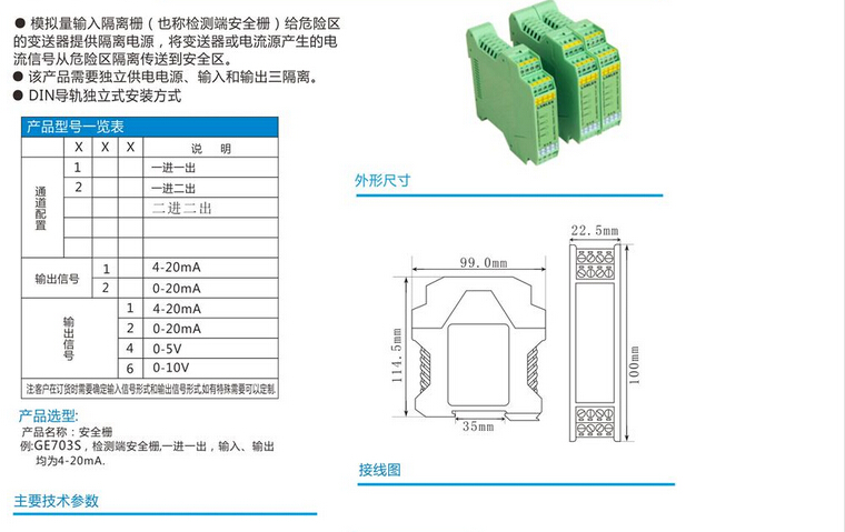 GE703S系列防爆安全柵4-20mA 隔離式安全柵 檢測端安全柵, 將輸入信號檢測端4-20mA變換為相互隔離的信號,低功耗,低熱量,低漂移,DIN T型導(dǎo)軌安裝