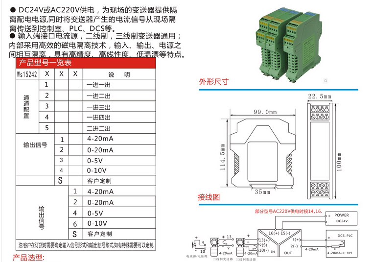 WS15242全隔離雙輸出信號(hào)分配器 隔離柵,信號(hào)隔離器模塊,安全柵,電流轉(zhuǎn)換模塊。將輸入信號(hào)變換為兩路相互隔離的信號(hào),低功耗,低熱量,低漂移,DIN T型導(dǎo)軌安裝