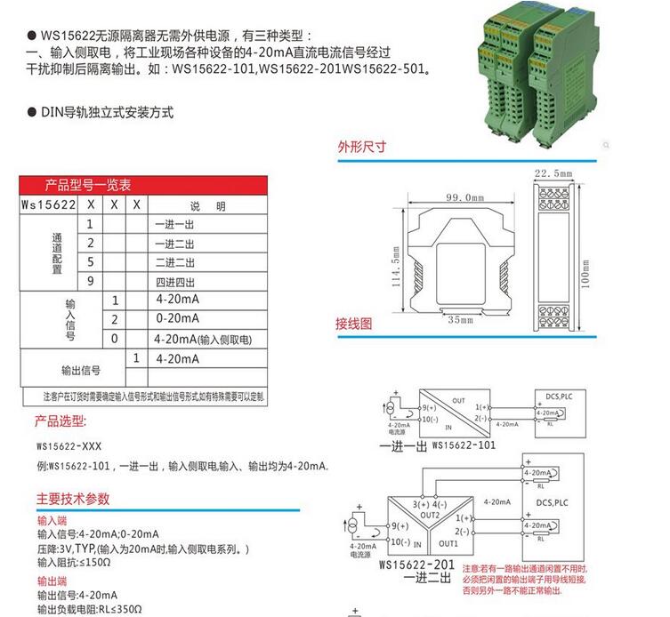 WS15622無源無源電流轉(zhuǎn)換模塊,信號隔離器,將輸入的一到四路信號隔離輸出,無需外接電源可正常工作,輸入輸出隔離,傳輸精度高,標(biāo)準(zhǔn)DIN T型導(dǎo)軌安裝