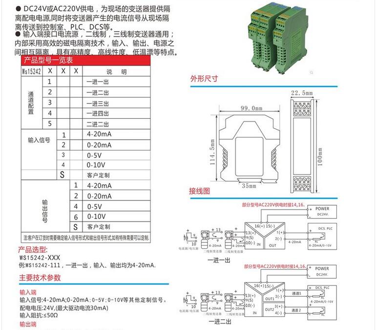 WS15242信號(hào)隔離器分配器,全隔離信號(hào)調(diào)理模塊,全隔離輸出信號(hào)分配器 安全隔離柵,信號(hào)隔離器模塊,安全柵,電流轉(zhuǎn)換模塊。將輸入信號(hào)變換為兩路相互隔離的信號(hào),低功耗,低熱量,低漂移,DIN T型導(dǎo)軌安裝