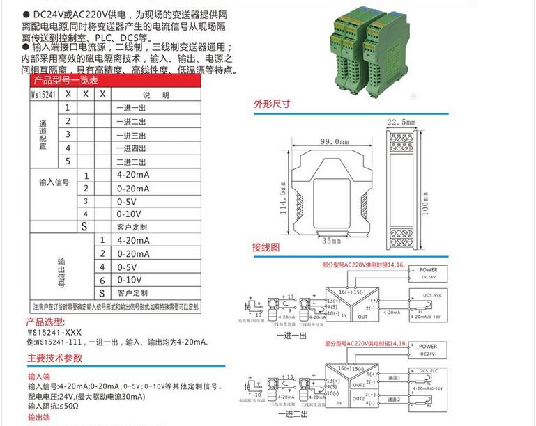 WS15241有源信號隔離器,全隔離輸出信號分配器 隔離柵,信號隔離器模塊,安全柵,電流轉(zhuǎn)換模塊。將輸入信號變換為兩路相互隔離的信號,低功耗,低熱量,低漂移,DIN T型導(dǎo)軌安裝