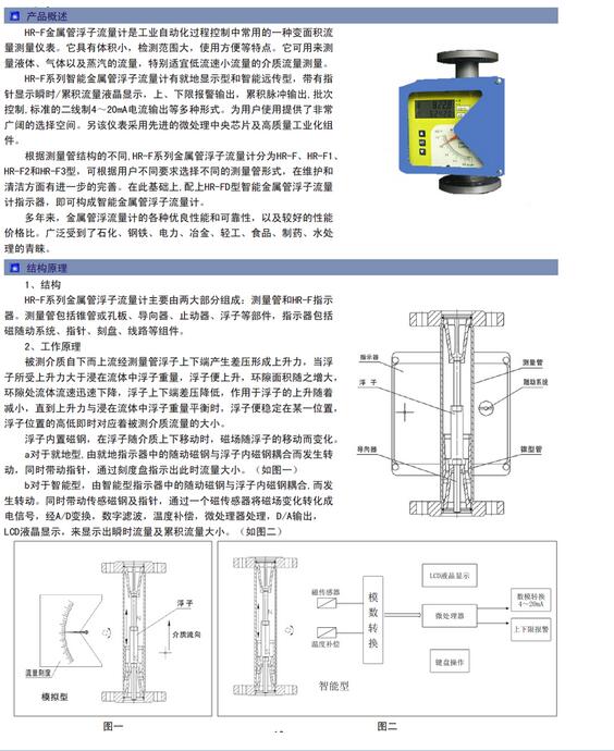 HR-F,智能金屬管浮子流量計HR-F金屬管浮子流量計是工業(yè)自動化過程控制中常用的一種變面積流量測量儀表。它具有體積小,檢測范圍大,使用方便等特點。它可用來測量液體、氣體以及蒸汽的流量,特別適宜低流速小流量的介質(zhì)流量測量。