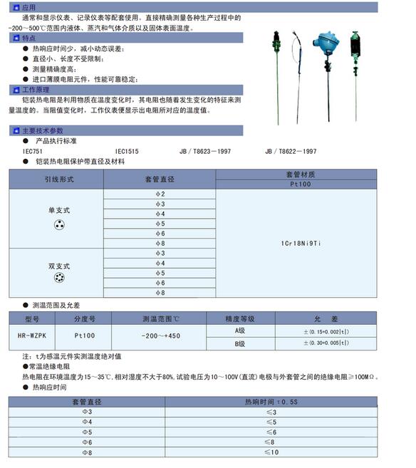HR-WZ,HR-WZPK,鎧裝熱電阻通常和顯示儀表、記錄儀表等配套使用。直接精確測量各種生產(chǎn)過程中的-200~500℃范圍內(nèi)液體、蒸汽和氣體介質(zhì)以及固體表面溫度。