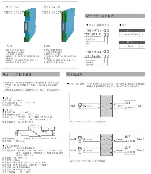 產(chǎn)品型號(hào): TMTY6711, TMTY6711C, TMTY6712, TMTY6712C,TMTY6711-PA,TMTY6711C-PA,TMTY6712-PA,TMTY6712C-PA, 輸入類(lèi)型:4-20mA 輸出類(lèi)型:4-20mA 二線制隔離配電器:TMTY6711/6711C 1入1出;TMTY6712/6712C 2入2出
