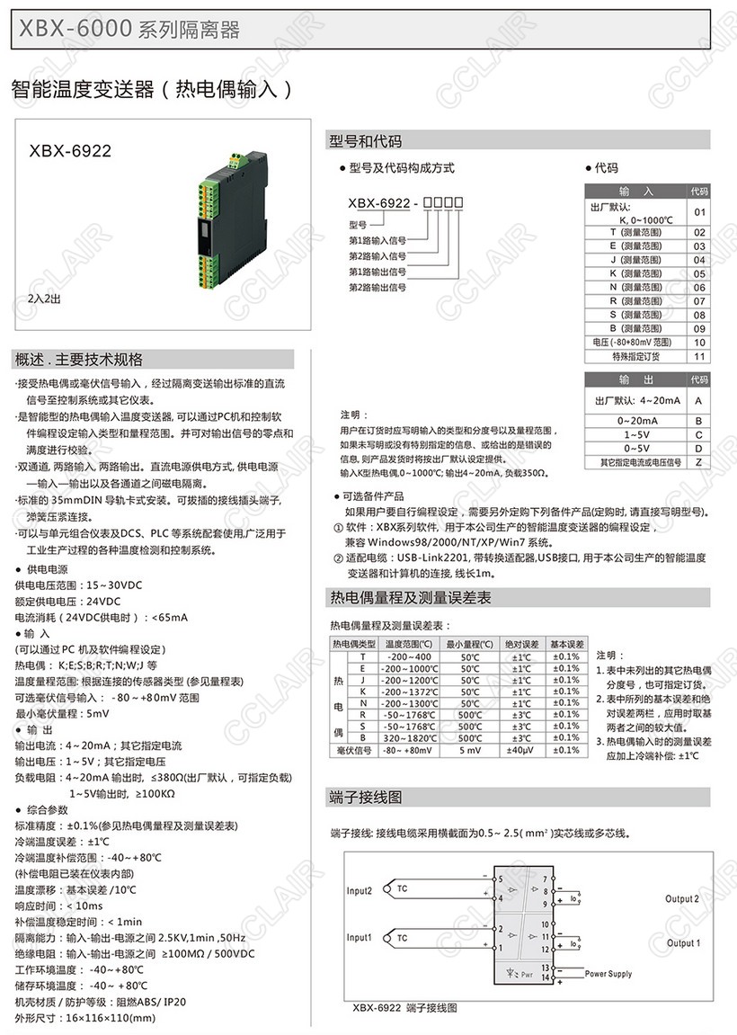 XBX-6922,XBX-6922-01A,,XBX-6922-02A,智能溫度變送器(熱電偶輸入)(二入二出)