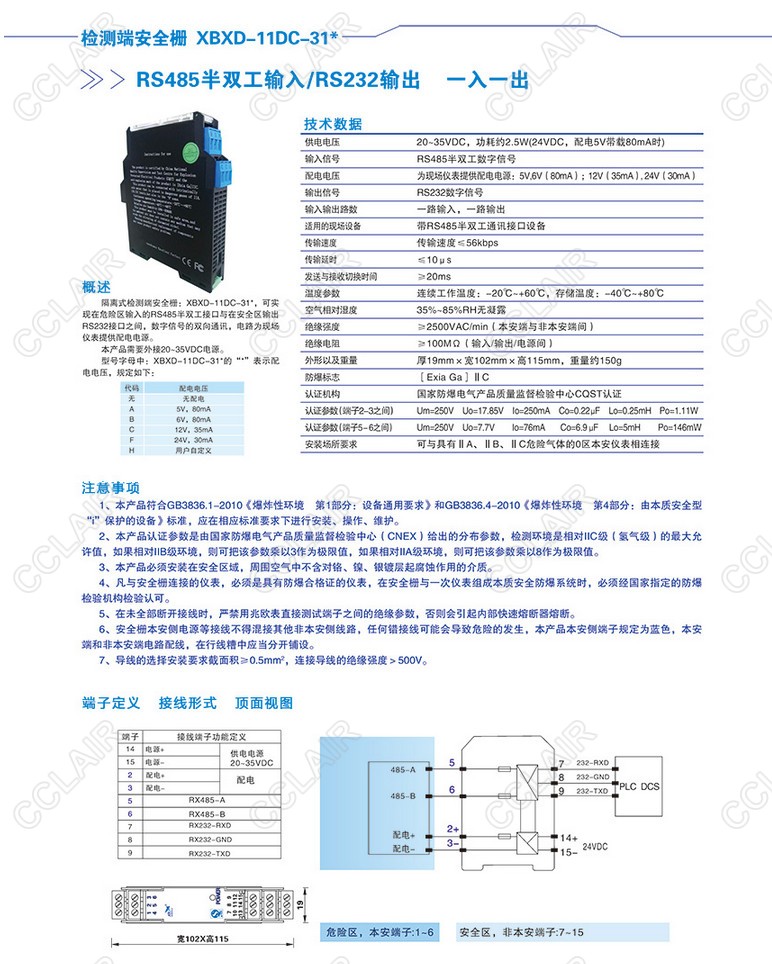 XBXD-11DC-31A,XBXD-11DC-31B,XBXD-11DC-31C,檢測(cè)端安全柵半雙工輸入/RS232輸出(一入一出)