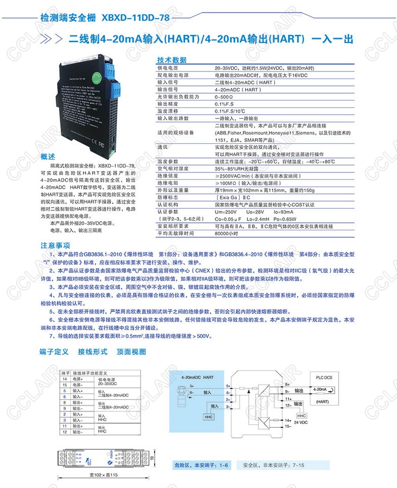 XBXD-11DD-78二線制4-20mA輸入(HART)/4-20mA輸出(HART)(一入一出)
