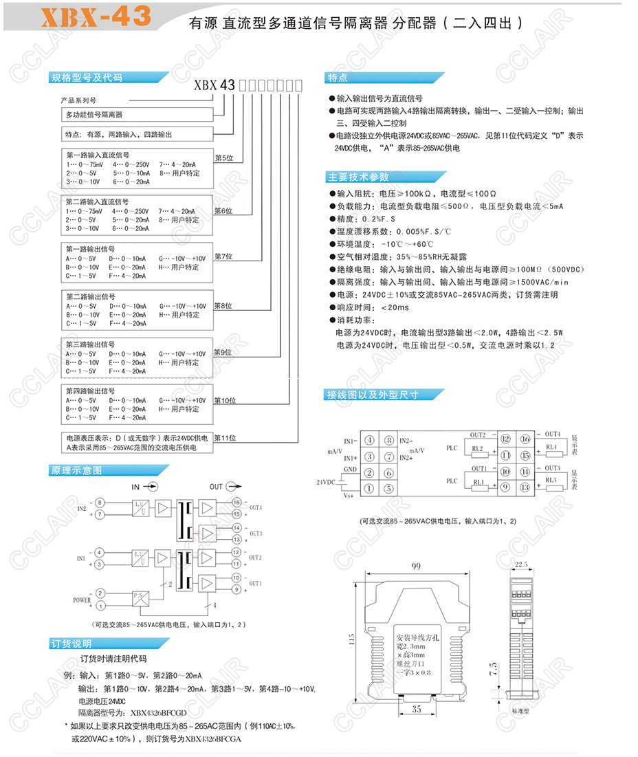 XBX-43,XBX-43-11AAAA,XBX-43-22AAAA,有源直流型多通道信號(hào)隔離分配器(二入四出)