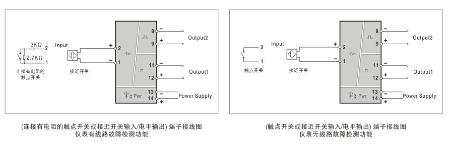 本儀表出廠設(shè)定為: 當檢測到輸入線路故障時, 儀表面板上的故障檢測指示燈亮,輸出繼電器觸點為松開狀態(tài) ( 如果是晶體管輸出,則晶體管不導(dǎo)通; 如果是電平信號輸出, 則輸出為低電平信號)。