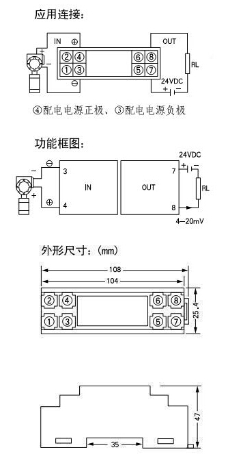 二線制4-20mA輸出;二線制4-20mA輸入;DIN T型導(dǎo)軌卡裝方式。