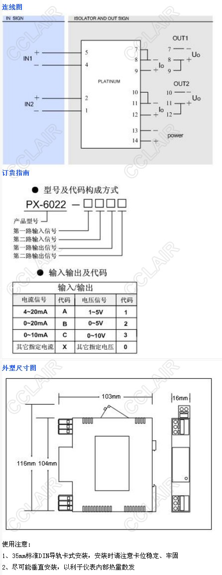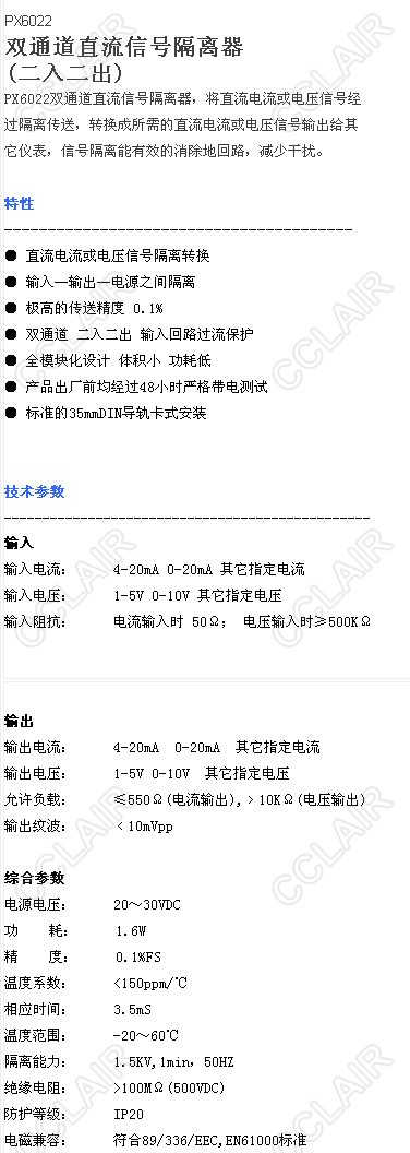 PX6022A1,PX6022A2,PX6022A3,PX6022A0,PX6022雙通道直流信號隔離器 (二入二出)