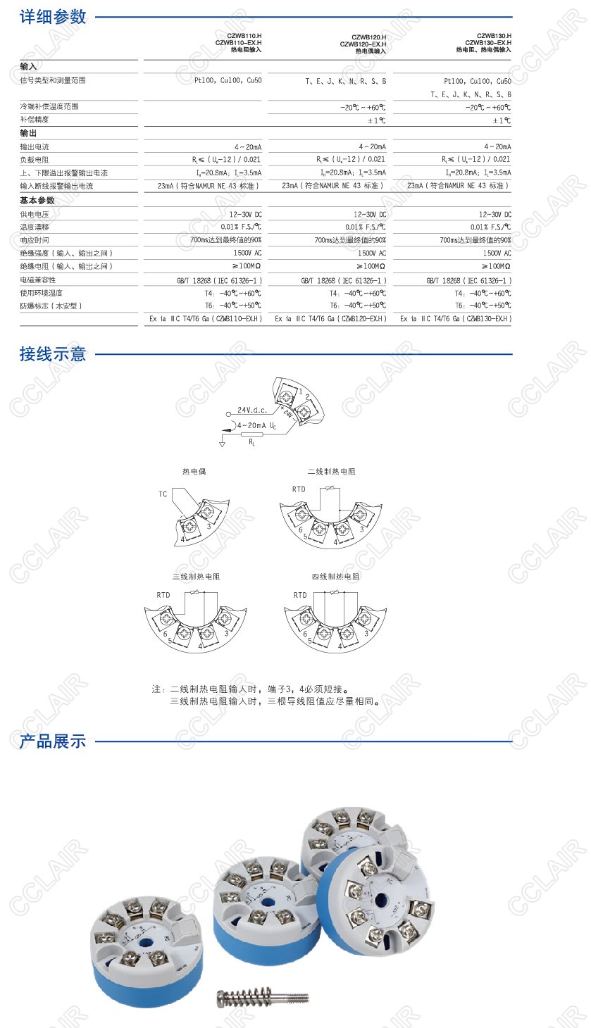 CZWB130.H 熱電阻熱電偶輸入、HART智能隔離溫度變送器 支持HART通信 輸入與輸出隔離,抗干擾性強(qiáng),信號(hào)類(lèi)型和測(cè)量范圍可編程,橢圓安裝孔,可適配多種傳感器殼體。 CZWB130-EX.H 熱電阻熱電偶輸入、HART智能、本安防爆隔離溫度變送器 支持HART通信 輸入與輸出隔離,抗干擾性強(qiáng),信號(hào)類(lèi)型和測(cè)量范圍可編程,橢圓安裝孔,可適配多種傳感器殼體。