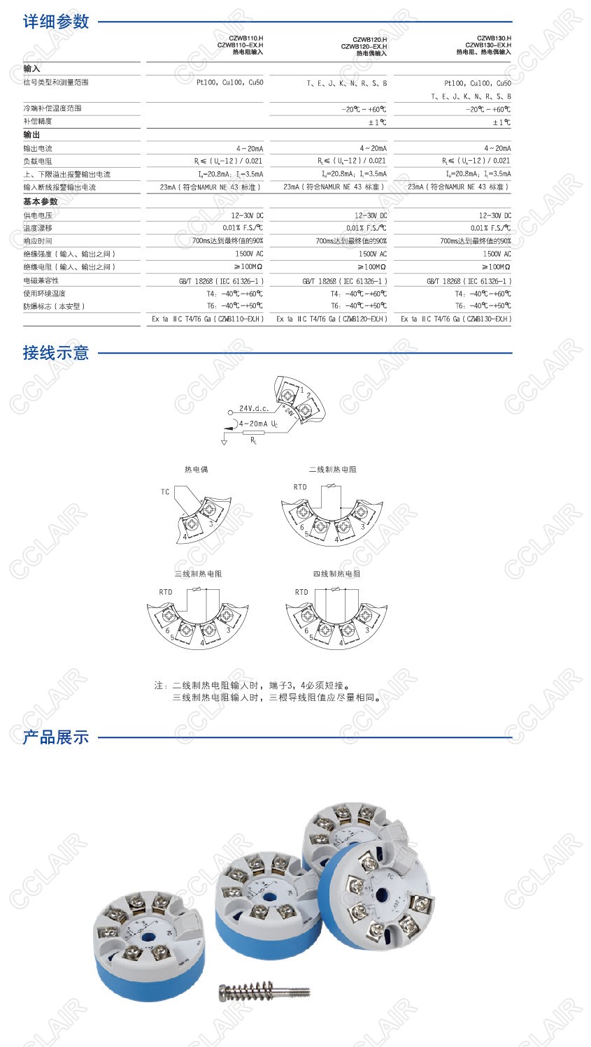 CZWB120.H 熱電偶輸入、HART智能隔離溫度變送器 支持HART通信 輸入與輸出隔離,抗干擾性強,信號類型和測量范圍可編程,橢圓安裝孔,可適配多種傳感器殼體。 CZWB120-EX.H 熱電偶輸入、HART智能、本安防爆隔離溫度變送器 支持HART通信 輸入與輸出隔離,抗干擾性強,信號類型和測量范圍可編程,橢圓安裝孔,可適配多種傳感器殼體。