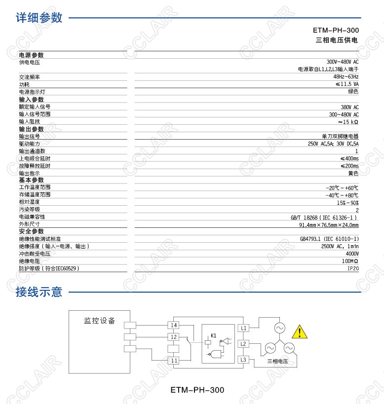 ETM-PH-300相序監(jiān)控繼電器實現(xiàn)對三相網(wǎng)絡(luò)的相序故障和缺相故障的監(jiān)控。該模塊具有1路單刀雙擲繼電器輸出,電源取自輸入L1,L2,L3端子。輸入和輸出兩隔離。