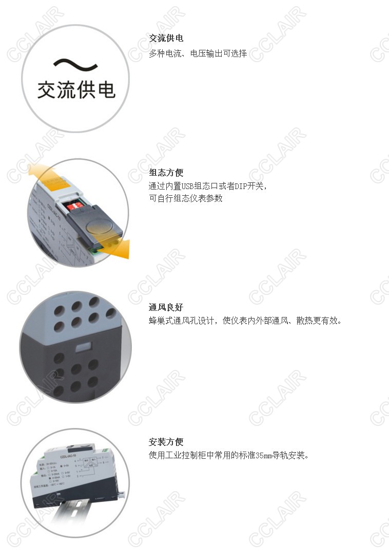 小巧的外殼結(jié)構(gòu),35mm標準導(dǎo)軌安裝方式,多種電流、電壓輸出可選擇。