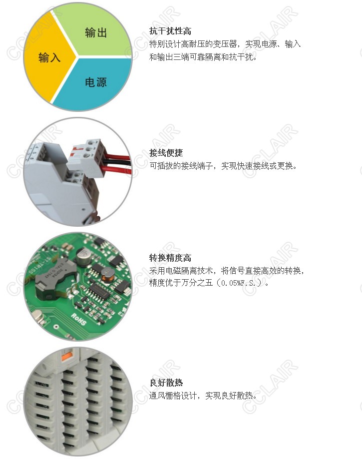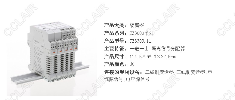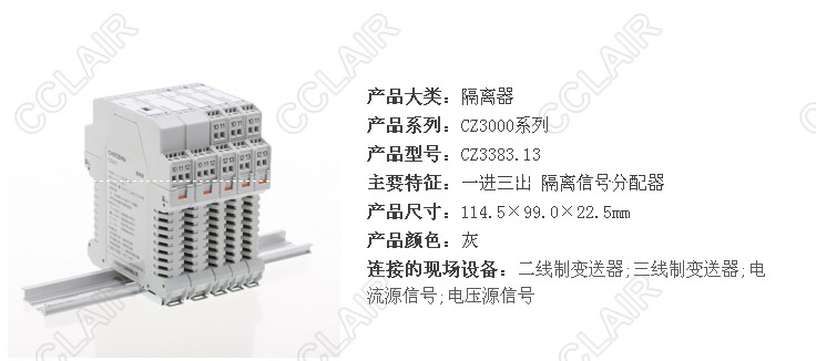 二線制、三線制變送器、電流源、電壓源輸入隔離信號分配器,可為變送器提供隔離電源,將變送 器 產生的0/4~20mA信號(也可以是電流源信號或0/1~5V、0/2~10V電壓信號)轉換成0/4~20mA電流信號或0/1~5V、0/2~10V電壓信號輸出。該產品需要獨立供電,電源、輸入和輸出三隔離,各輸出通道之間亦隔離。