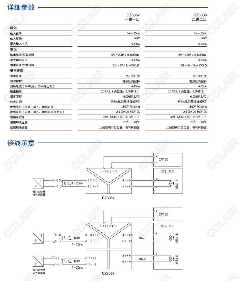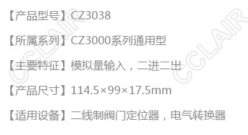 CZ3067 一進一出 模擬量輸出隔離器 可驅(qū)動內(nèi)阻高達800Ω的閥門定位器,4~20mA或0~20mA均保證精度,轉(zhuǎn)換精度高于萬分之五(0.05%F.S.)。 CZ3038 二進二出 模擬量輸出隔離器 可驅(qū)動內(nèi)阻高達800Ω的閥門定位器,4~20mA或0~20mA均保證精度,轉(zhuǎn)換精度高于萬分之五(0.05%F.S.)。