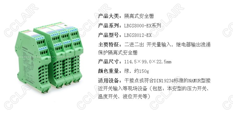 具有防雷擊浪涌保護功能的開關量輸入,繼電器輸出安全柵。它的功能是接收來自危險區(qū)的開關和接近開關輸入,通過安全柵隔離傳輸?shù)桨踩珎壤^電器輸出。它具有輸入斷線檢測報警及輸入輸出反相設置功能。該產品需要獨立供電,電源、輸入和輸出三隔離。