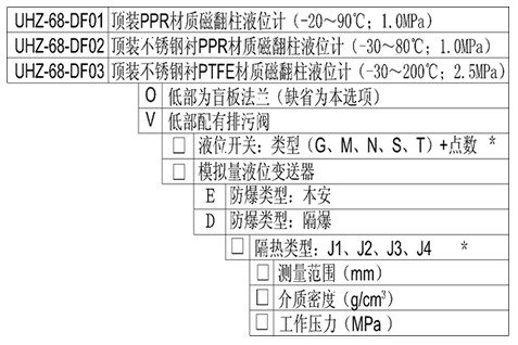 UHZ-68-CF01/CF02/CF03/CF04為四種側(cè)裝式防腐型磁翻柱液位計,CF01的材質(zhì)為加強型PVC,主 要特 點是經(jīng)濟實用,缺點是易老化,不易在露天環(huán)境下使用;CF02的材質(zhì)為PPR,可以用于一般場合的 防腐使 用;CF03的材質(zhì)為不銹鋼內(nèi)襯PPR,強度和使用壽命較CF02型均有提高; CF04的材質(zhì)為不銹鋼 內(nèi)襯PTFE, 主要特點是具有較高的耐腐蝕的性能和優(yōu)秀的耐溫、承壓性能。